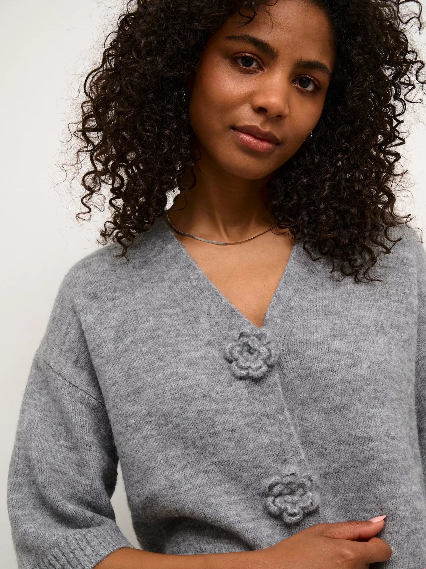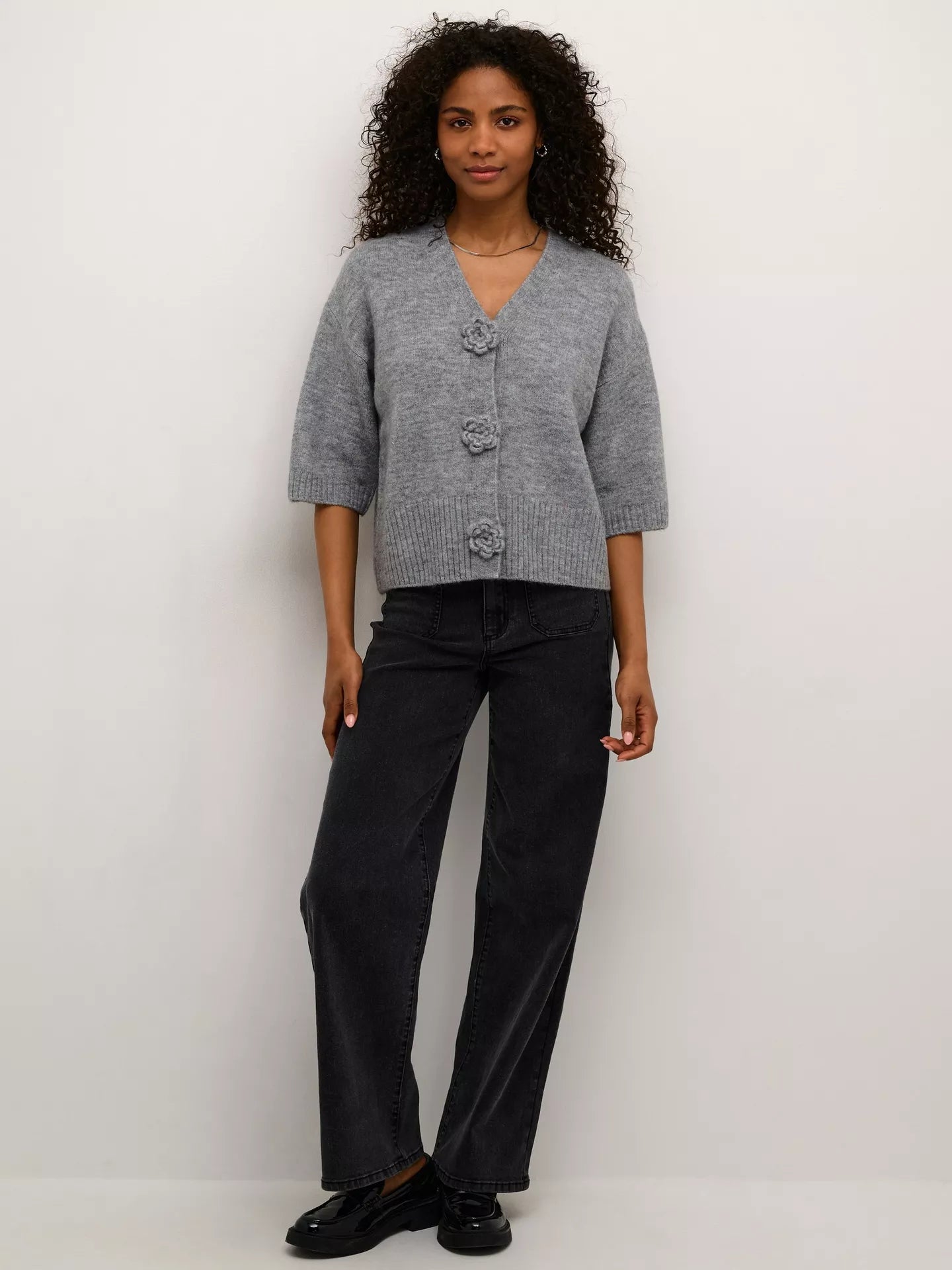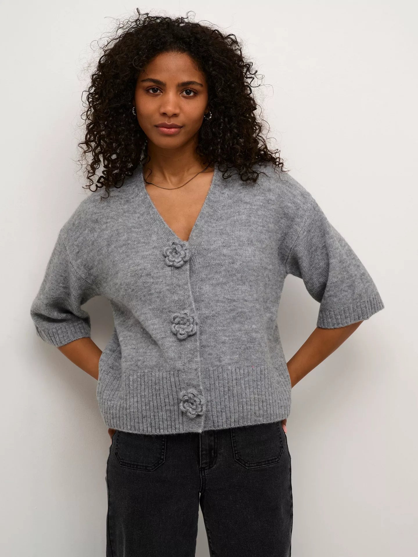 Cardigan with a boxy, straight fit and cropped length, featuring a soft textured finish. Distinctive flower-shaped front buttons and mid-length sleeves elevate the minimal design.