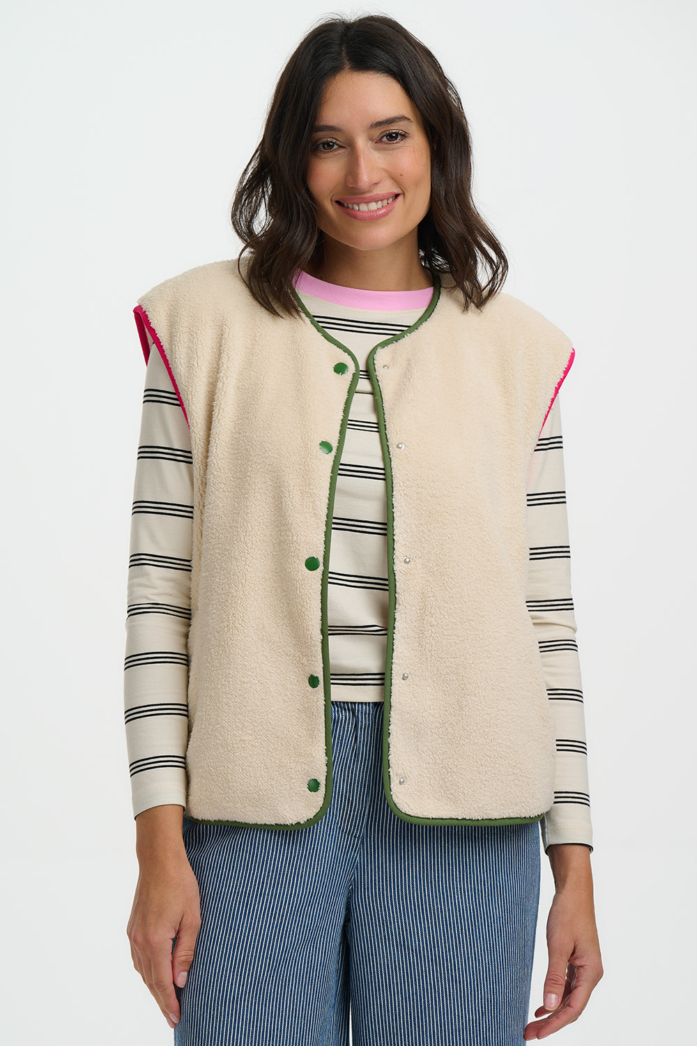 The Sophie Fleece Gilet is a cosy layering essential with a relaxed, easy-to-wear fit. Crafted in soft oatmeal fleece, it features a sleeveless design, popper button fastening and contrast green binding for a playful finish. Perfect for throwing on over knits or long-sleeve tees, Sophie adds warmth without bulk for everyday comfort.