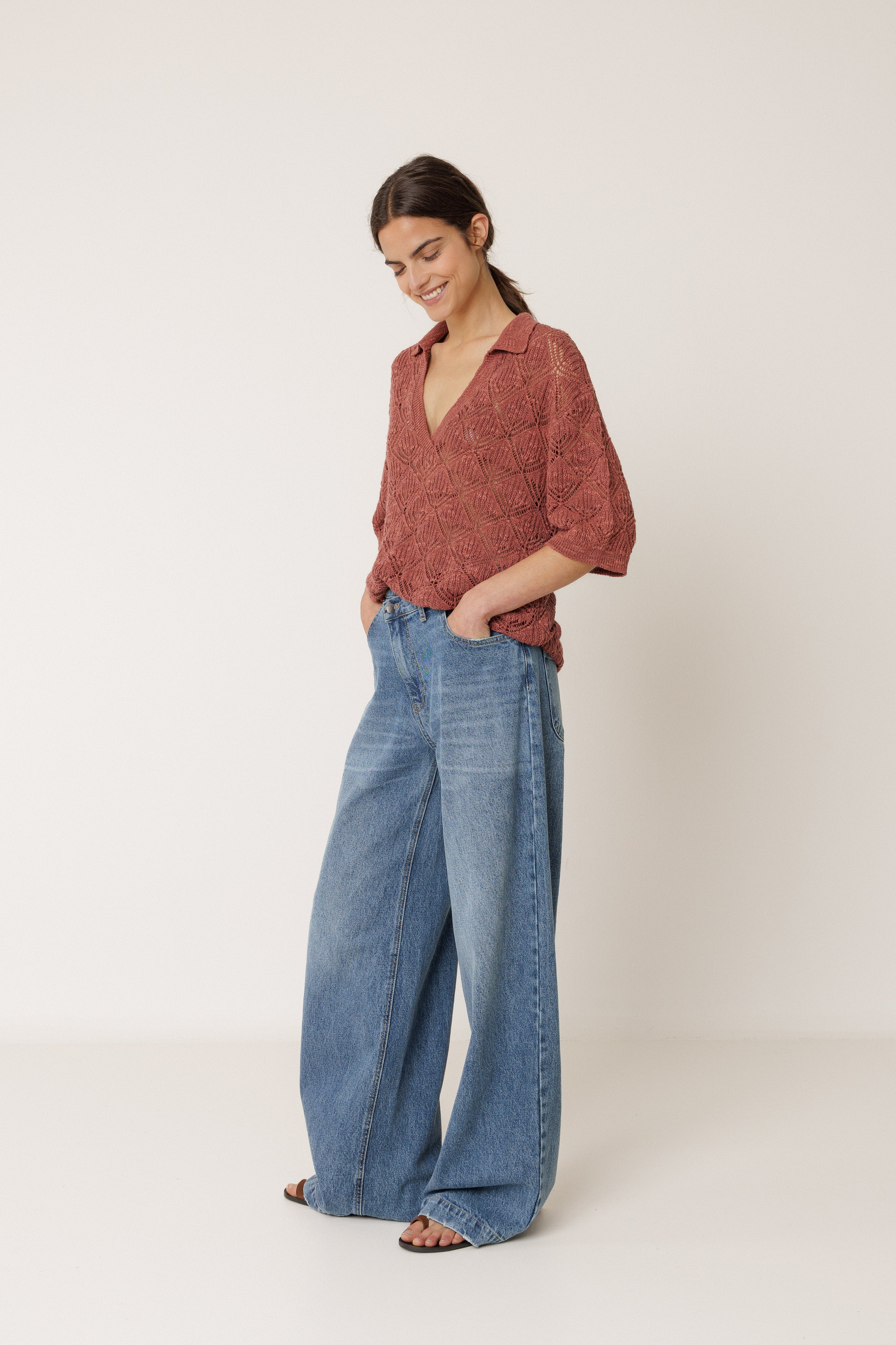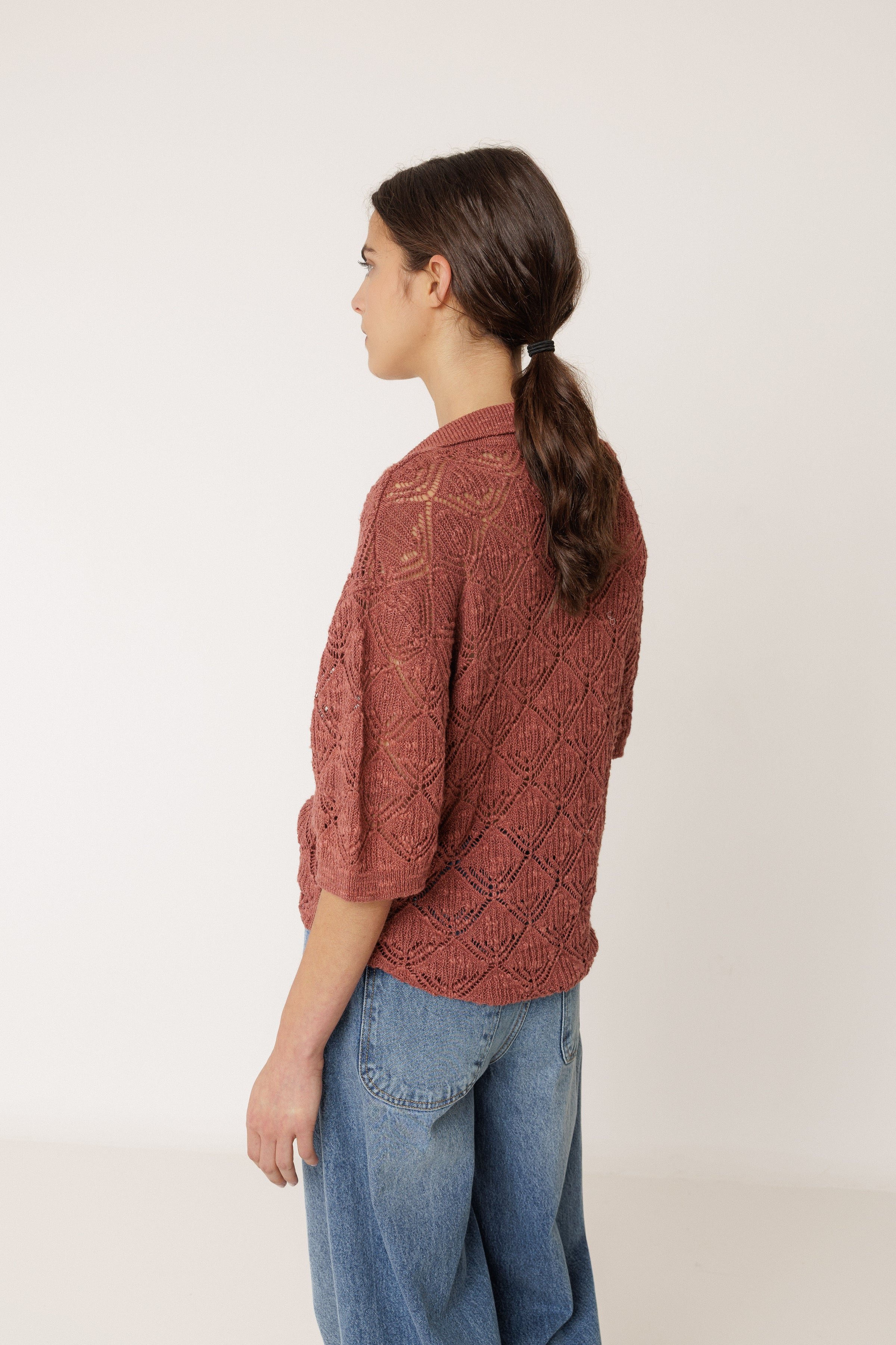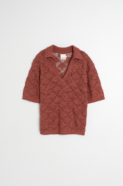 With a unique open-weave design, this knit T-shirt by Indi & Cold arrives in a warm terracotta shade for summer styling. It's crafted from a soft blend of fabrics, including linen for a breezy breathable feel.