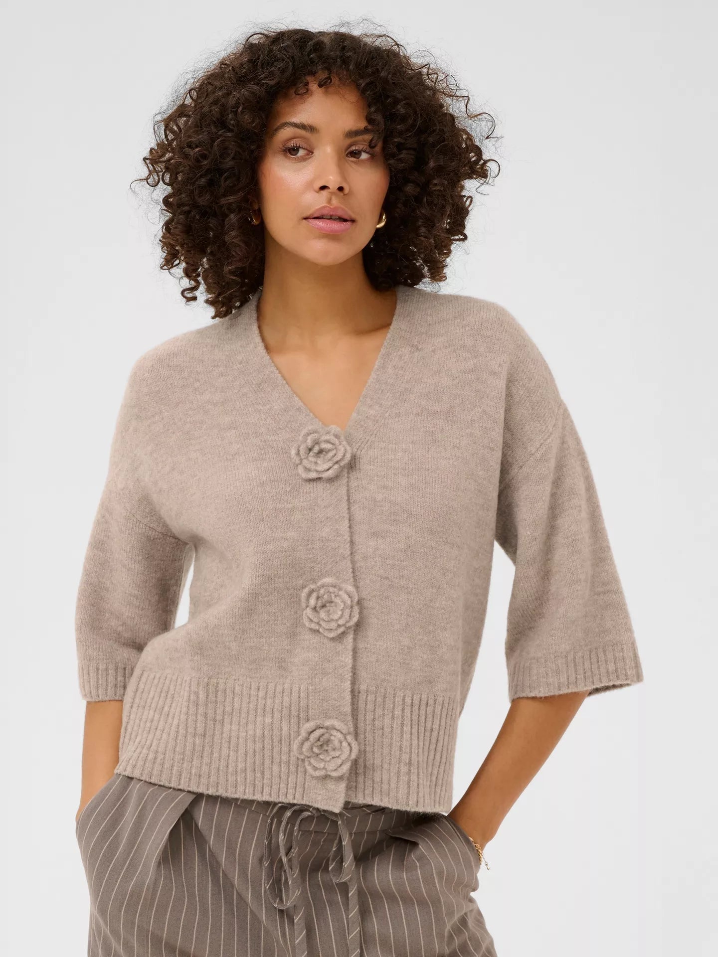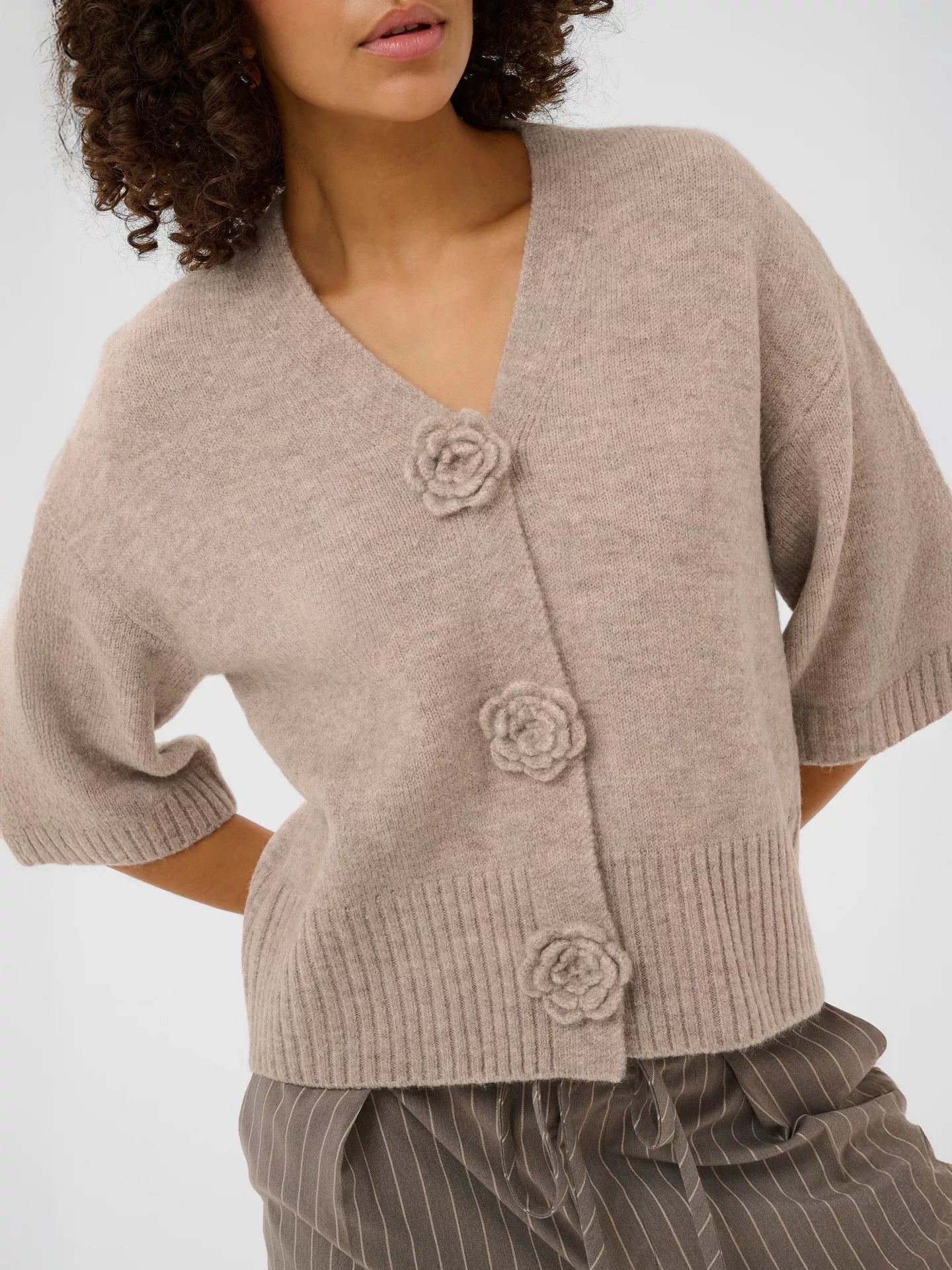 Cardigan with a boxy, straight fit and cropped length, featuring a soft textured finish. Distinctive flower-shaped front buttons and mid-length sleeves elevate the minimal design.