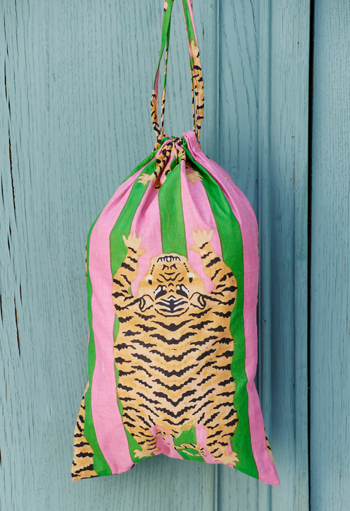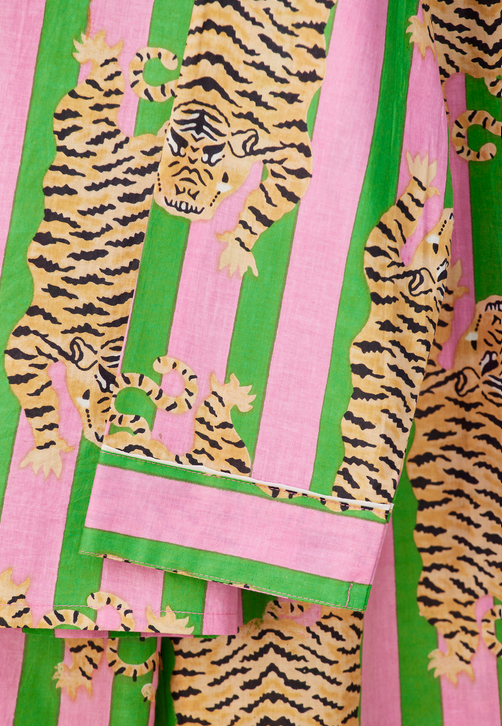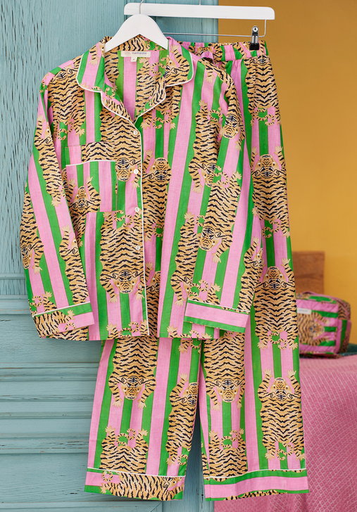 A bold screen-printed tiger design decorates these stylish pyjamas! Beautifully bright and daring, the pink and green colour palette contrasts splendidly with tiger stripes on machine-washable cotton. The bottoms have an elasticated waist with a pocket on each side and a decorative centre cord. For total coordination and easy travel, each pair arrives in a matching drawstring bag.
