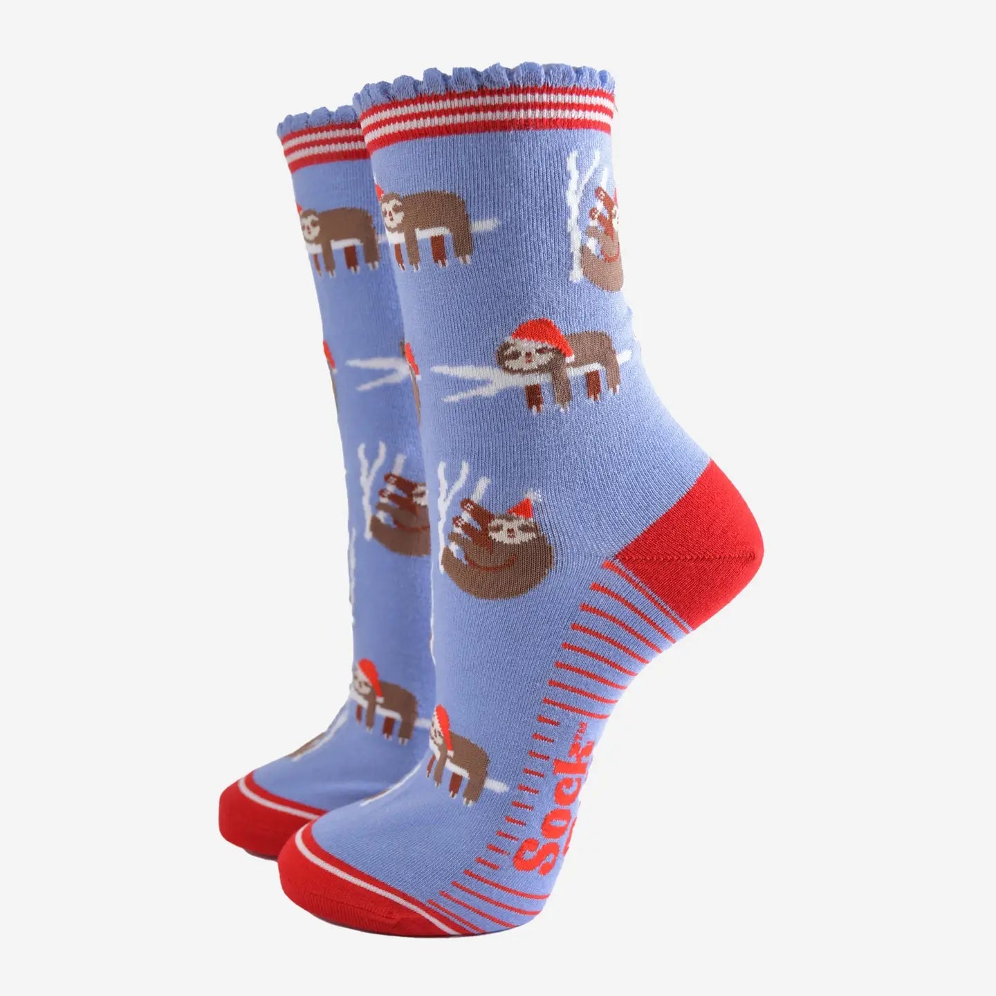 Designed in the UK, these festive socks are crafted from eco-friendly sustainable bamboo. Showcasing sleepy sloths wearing Santa hats. A light blue design with a contrasting red striped cuff, these cute socks feel luxuriously soft.
