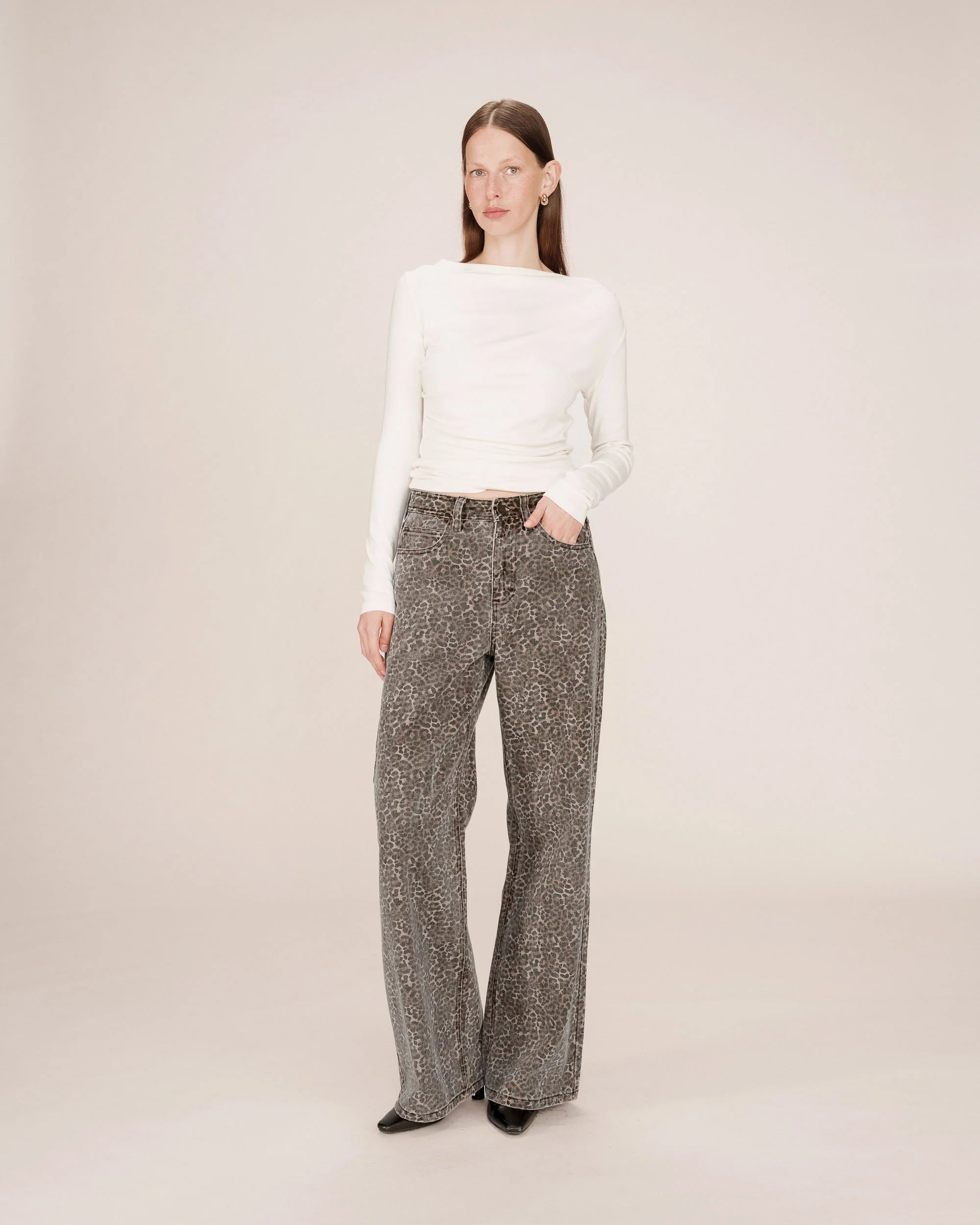 The SOCCA loose pants revisit the timeless leopard print with a loose fit, creating a modern and trendy silhouette. The high waist and slightly flared leg offer a relaxed look and make it a versatile everyday piece. The SOCCA leopard pants feature a zip and button closure and a leather jacron on the back.