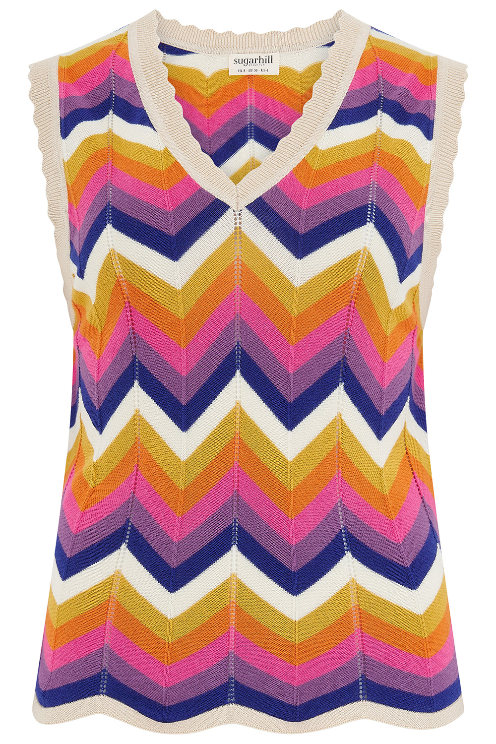 The Rosy Knit Vest is a V-neck sleeveless top with scalloped hems and pointelle detailing. Inspired by the SoCal summers of the 70s, the vibrant chevron stripes in orange, pink, yellow, blue, and white form a bold, energetic geometric pattern with dotted highlights. Pair with your fave jeans for a perfectly casual outfit.