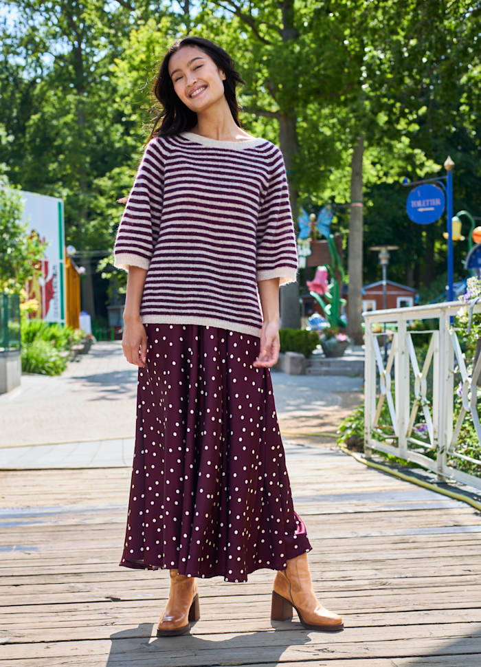 The Dell knit jumper is a lovely striped knit with a soft and lightweight quality. The model has short sleeves, a round neck and a relaxed fit, making it perfect for both layering in the cold, and on its own on warmer days. Comes in black stripe and plum stripe.