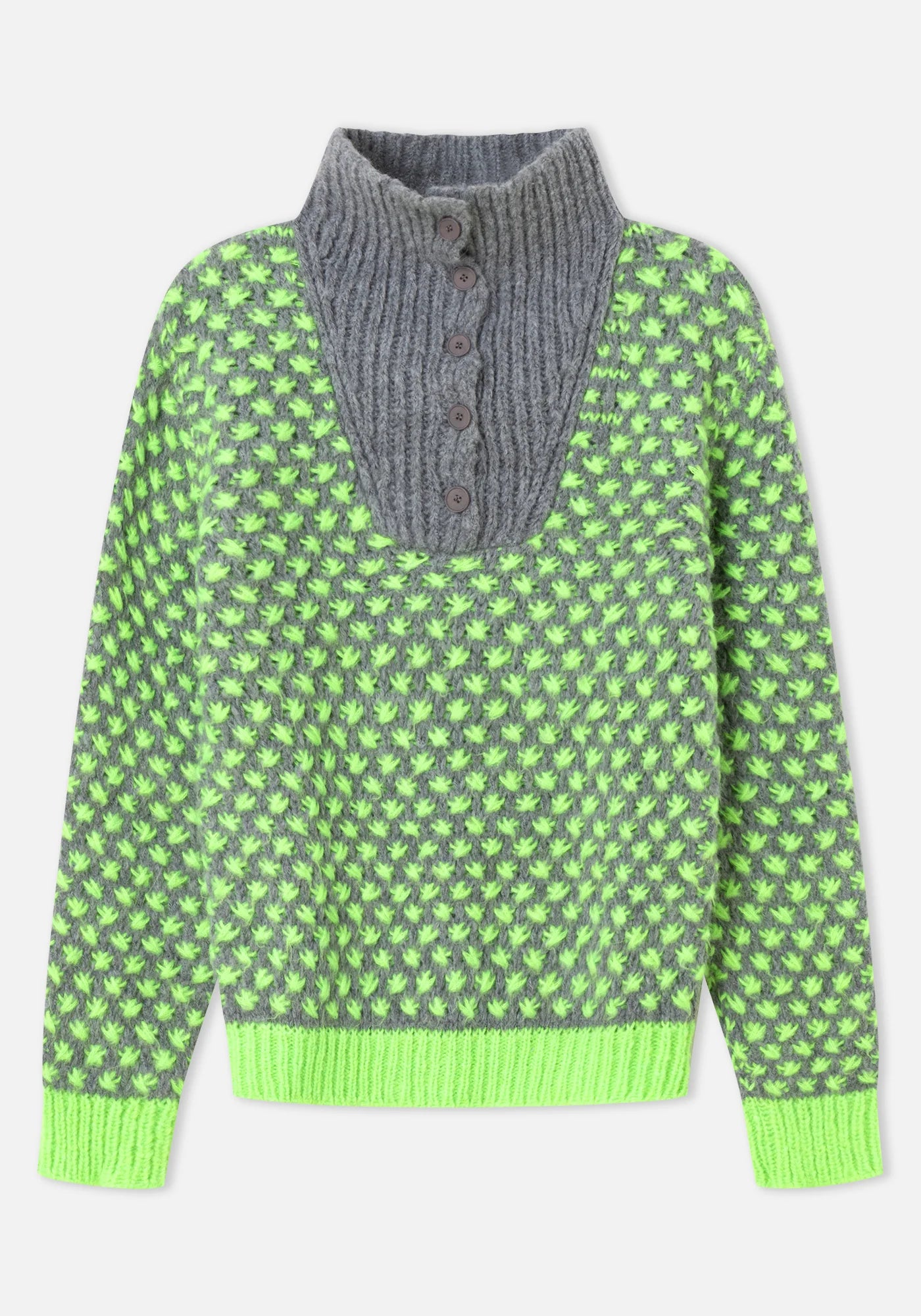 Straight-cut sweater with a starry pattern in gray and green. Cuffs and hem finished with wide green ribbing that adds structure and contrast to the design. Special detail of a ribbed funnel neck in thick gray knit with a front button closure, ideal for adding a versatile and warm touch to the look.