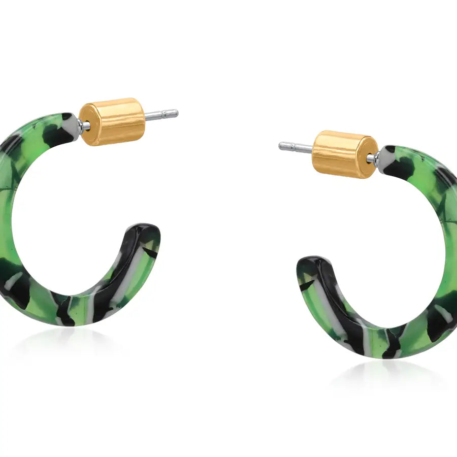 Modern and versatile, the Lucce Earrings reimagine the classic hoop in a petite resin silhouette. Available in rich green or cool blue, they bring a subtle splash of colour to everyday styling while keeping the look polished and contemporary. Each pair is handcrafted from sustainable resin made using recycled eyewear off-cuts, ensuring unique marbling and lighter environmental impact. Lightweight and easy to wear, they’re finished with hypoallergenic surgical steel posts, making them perfect for sensitive ears.