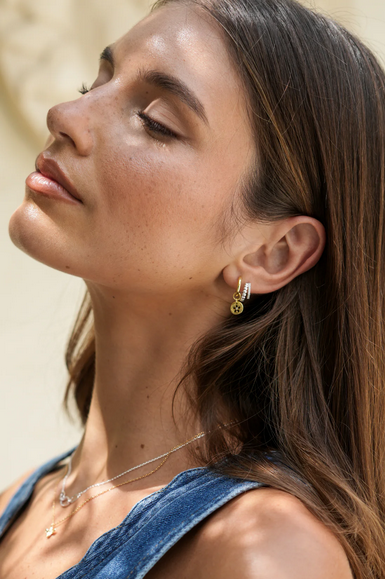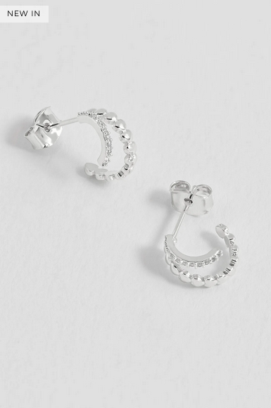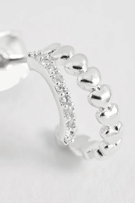 The plated Heart and CZ Double Illusion Huggie Hoops by Estella Bartlett feature one row of CZs next to a row of hearts. These are a must-have for when you want a stacked look without the need for any extra piercings, adding a touch of sparkly romance to your look.