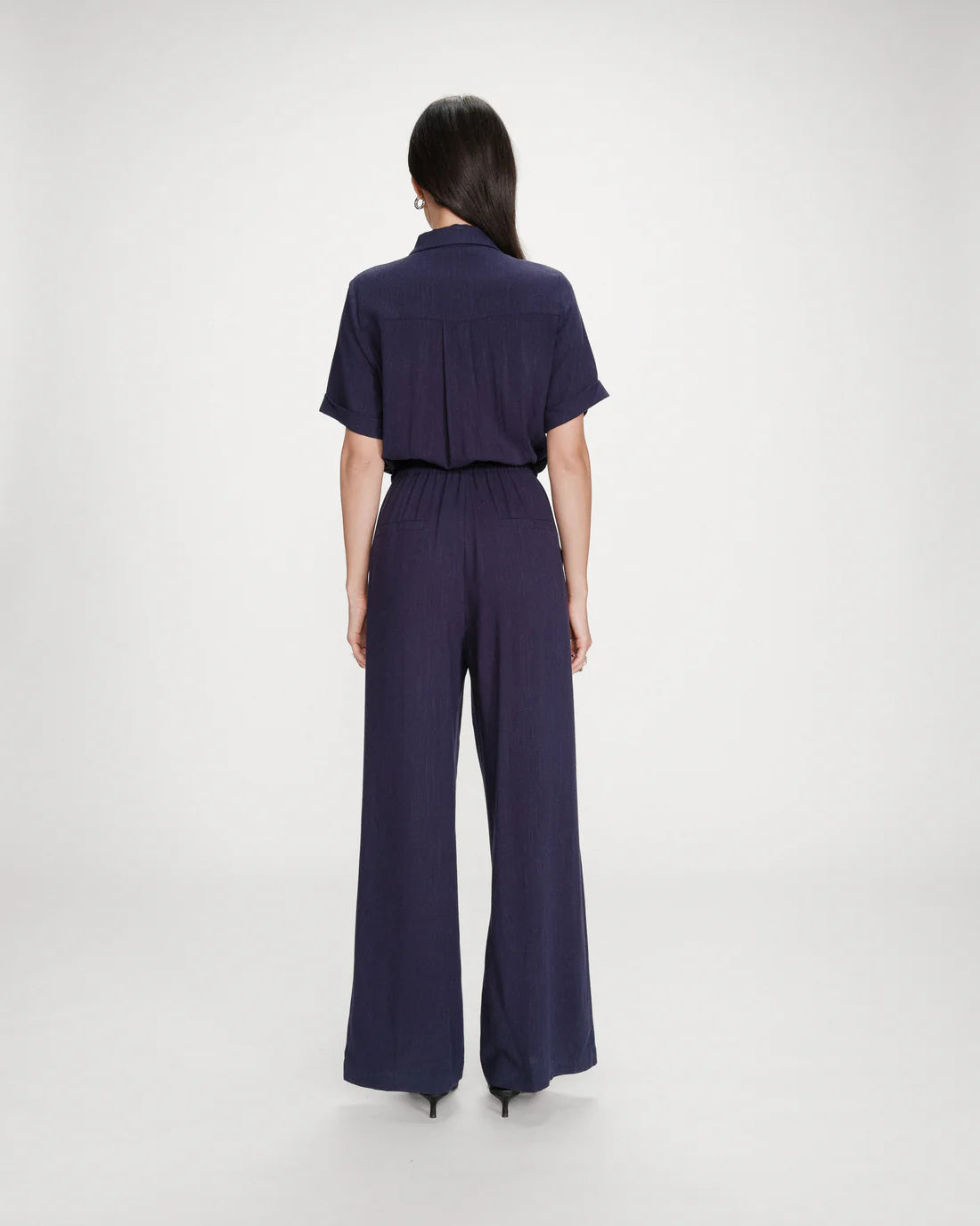 The VANELLE jumpsuit, made from a lightweight and fluid fabric, offers a feminine and relaxed silhouette. The patch pockets, waist tie, and front button placket highlight its utilitarian spirit and bold style.