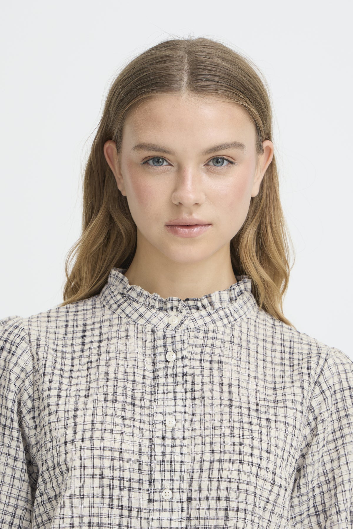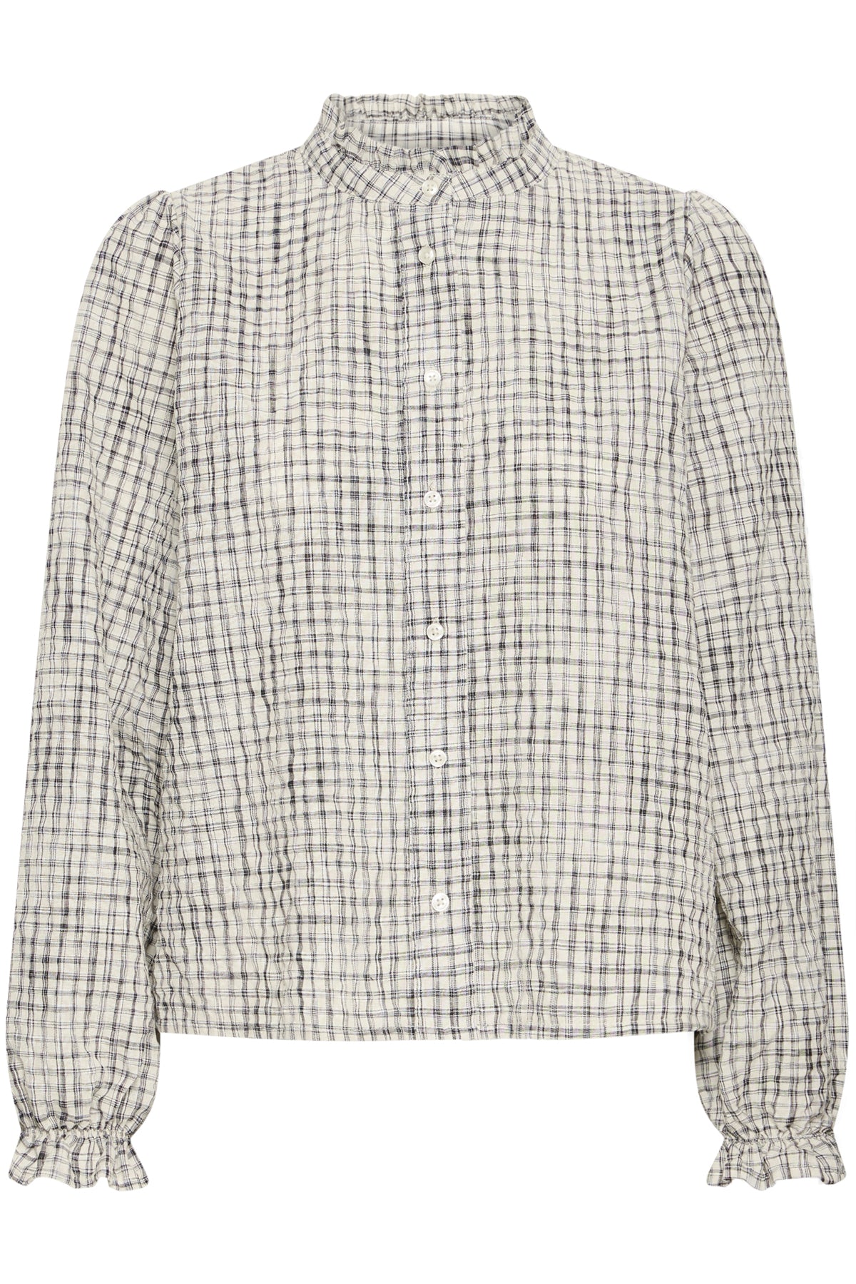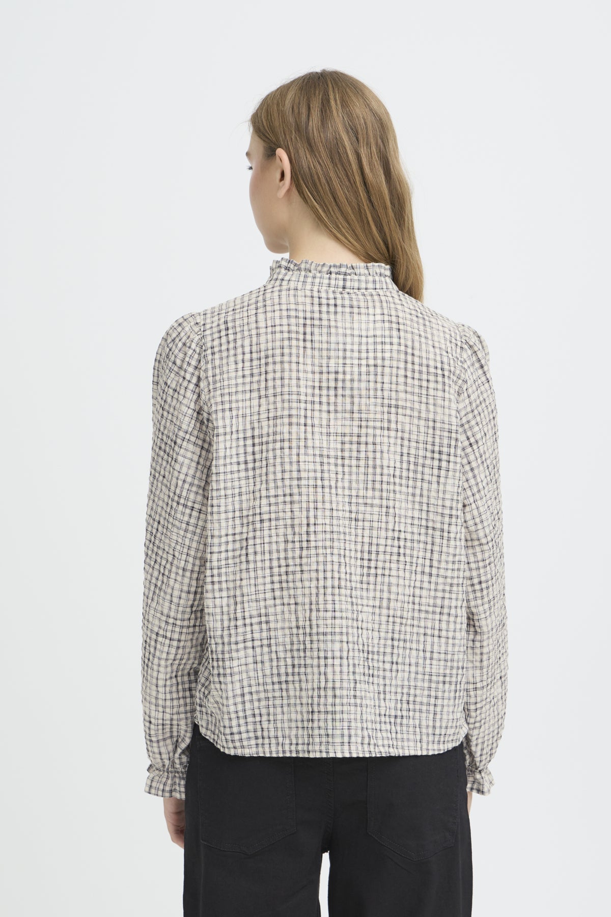 A lovely blouse with a ruffled neckline and a gathered cuff, great tucked into your favourite trousers or jeans.