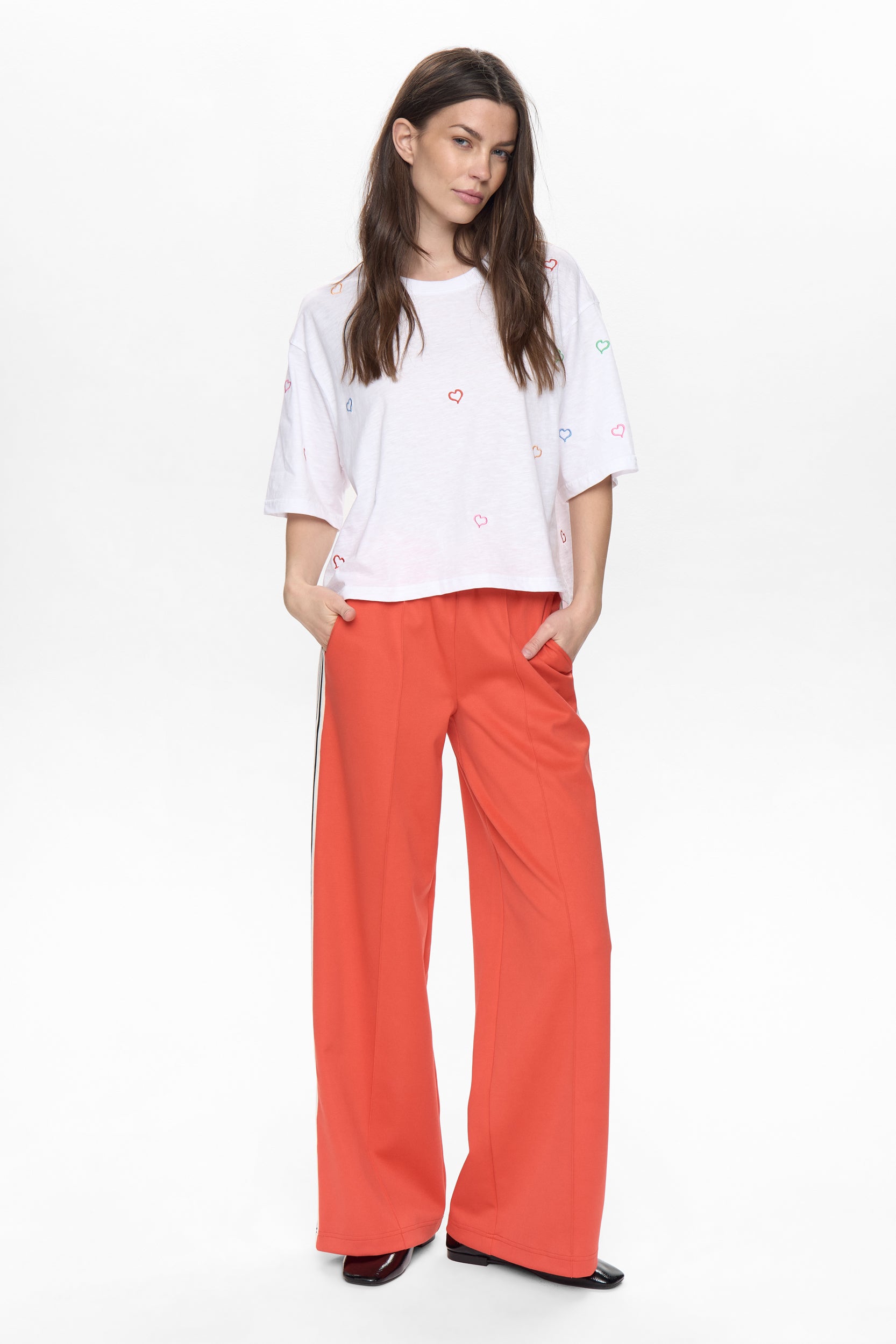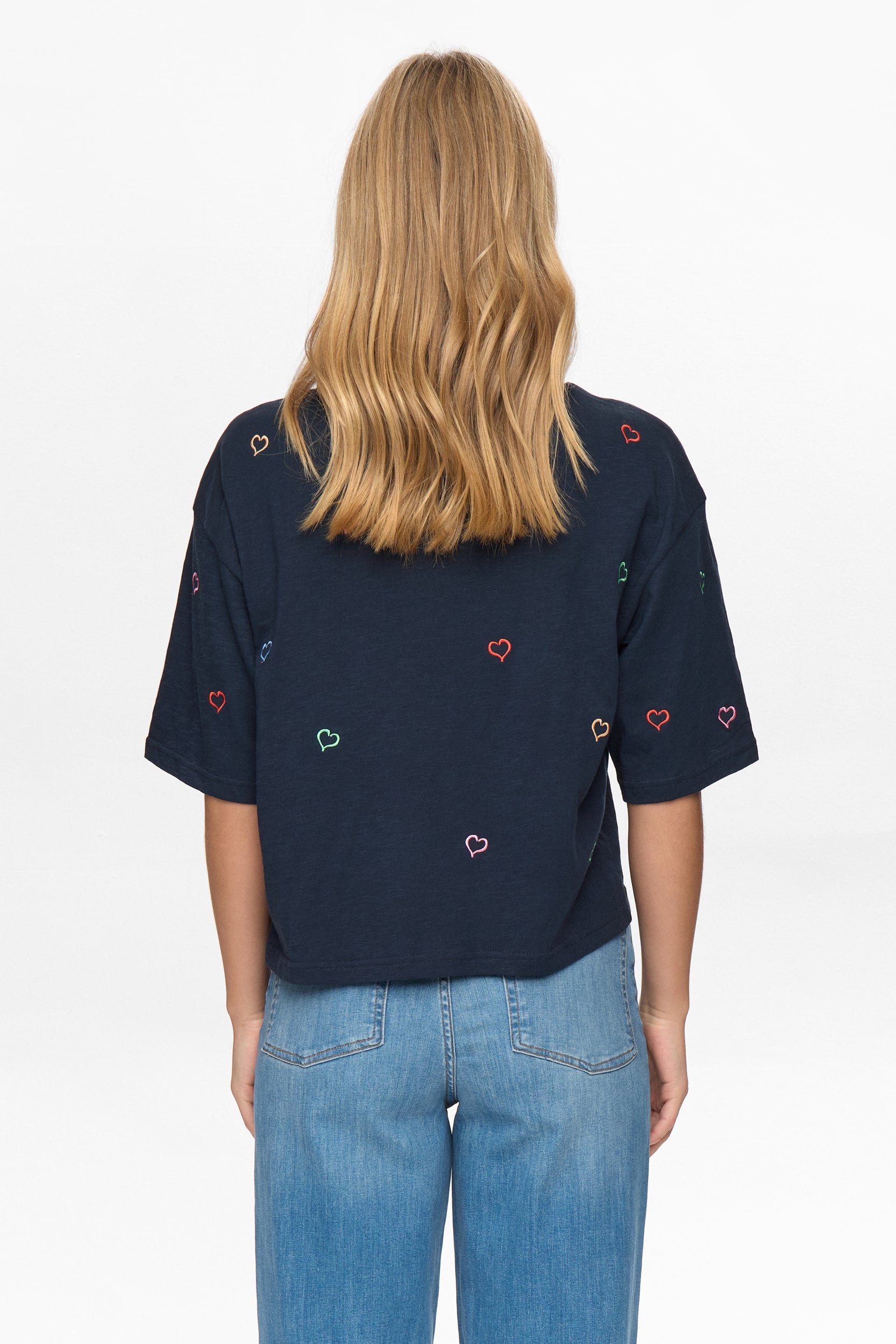 A pretty boxy style t-shirt with cute little embroidered hearts in different pastlel tones, available in black or white.