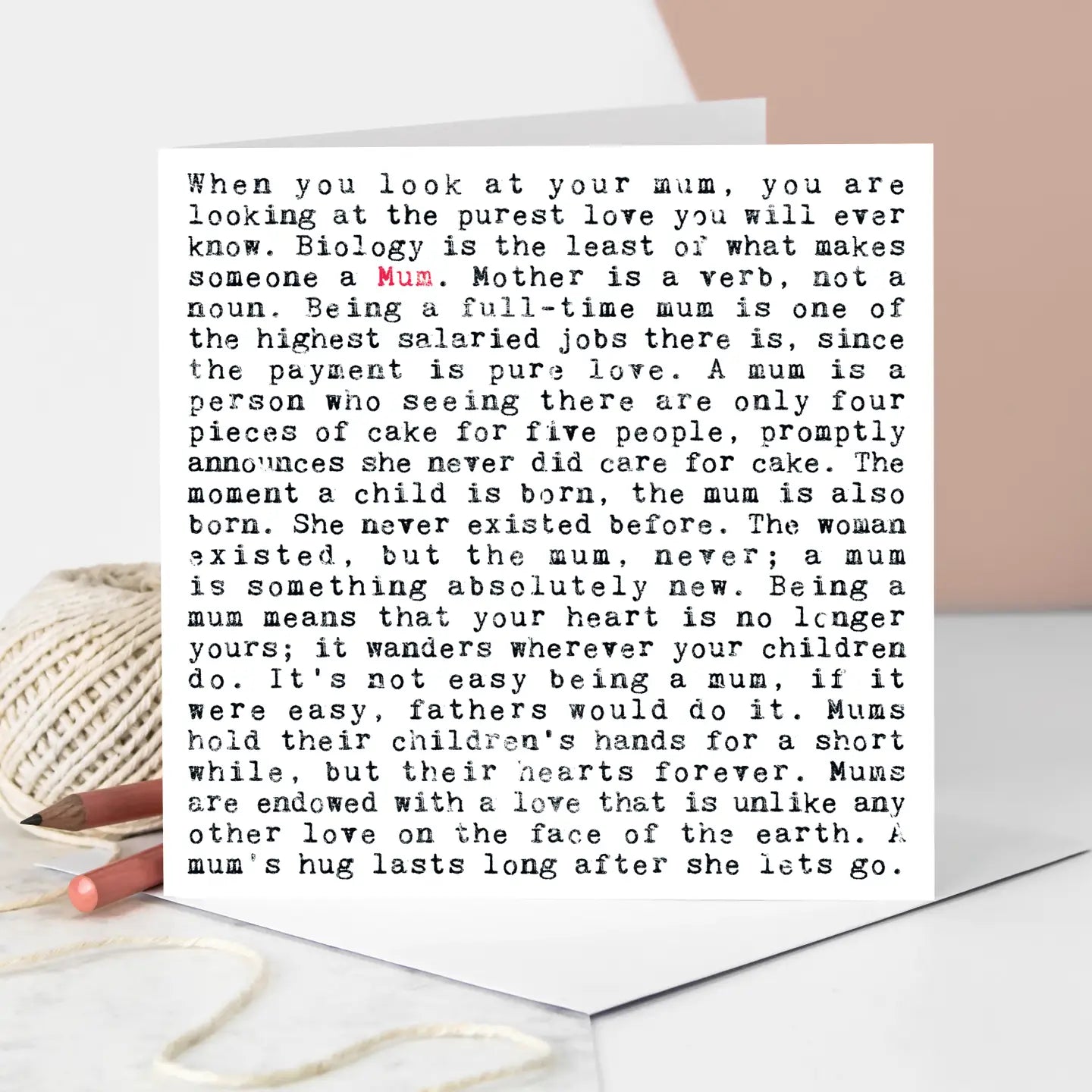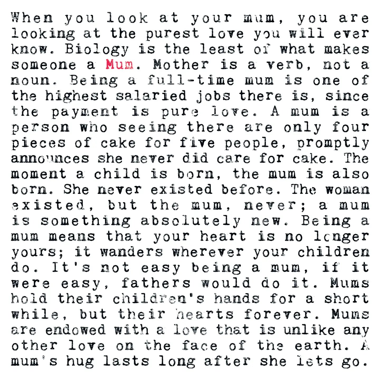 A unique greeting card for mum in a striking black and red design with a typewriter font. Featuring lots of heartwarming and funny quotes about motherhood and the word 'Mum.'